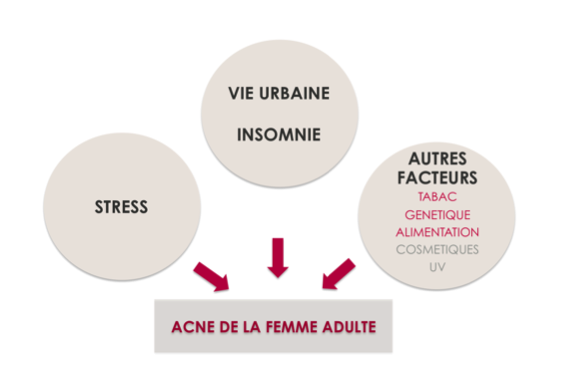 Jeśli jakieś czynniki sprzyjające są dobrze znane (zaburzenia hormonalne, nieodpowiednia antykoncepcja, tytończynniki genetyczne), wiele z tych czynników jest związanych z stres współczesnego życia. Ostatnie badania wykazują wzrost trądziku u kobiet pracujących, które zaburzenia snu. Istnieje również duża częstość występowania trądziku w rodzinie, szczególnie w przypadku trądziku ciężkiego.